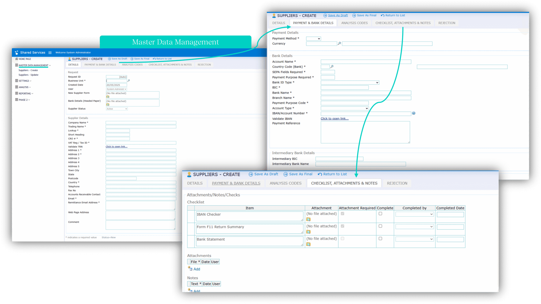 Multi-stage processes with statuses (Draft, Pending Approval, Pending Authorisation, Complete, Queried, Rejected, Void) for both new and updated supplier records.